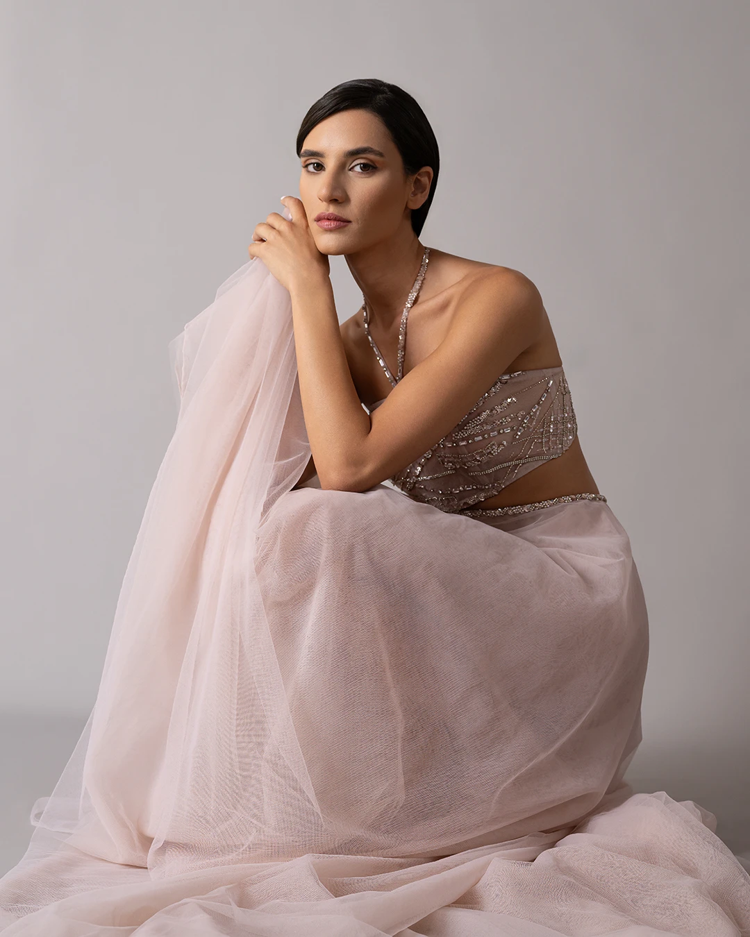 A flowing light blush dress featuring a strapless, cut-out bodice adorned with delicate geometrical hand-embroidered beadwork. The shimmering details accentuate the neckline and waist, creating a graceful contrast with the airy, layered skirt that drapes effortlessly to the floor. Elegant and ethereal, this dress perfectly balances modern sensuality with timeless sophistication.