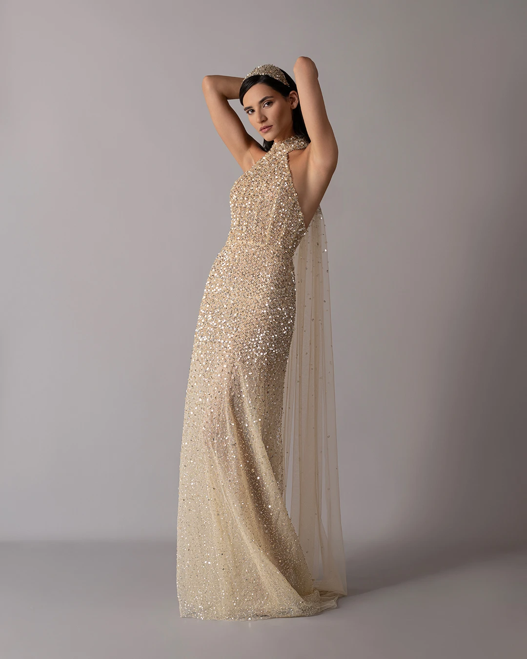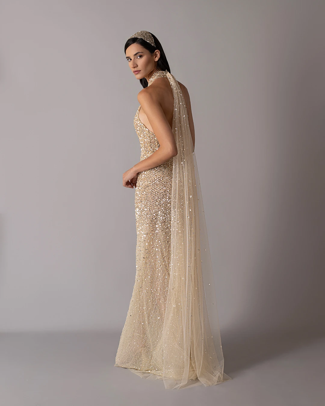 This metallic dress features hand-embroidered silver beaded stripes, a sharp pointy upper cut, and a V-shaped waist that creates a defined shape. Sleek and sculptural, it blends craftsmanship with bold, modern style.