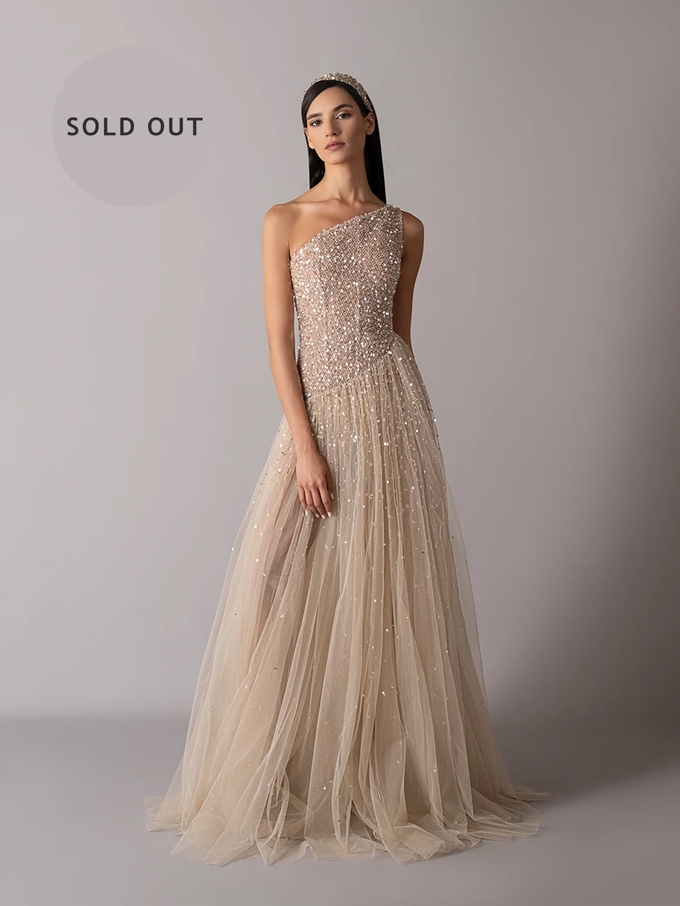 This purple dress is a true labor of love, crafted with exceptional attention to detail. The color was custom-developed, giving it a soft ethereal hue. Designed with a flattering V-shaped waist, the silhouette is further elevated by delicate lacets at the back allowing for an adjustable cinched fit. The embroidery is entirely executed by hand with thousands intricate beads and crystals.