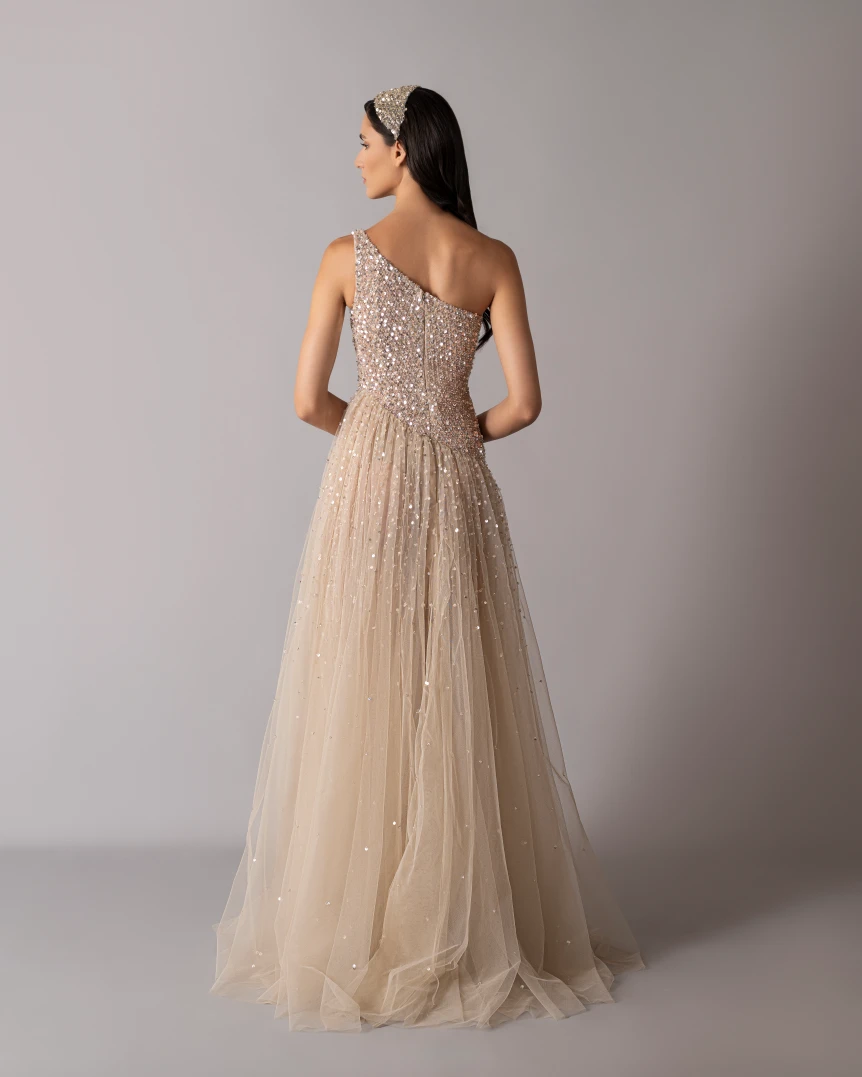 This nude dress breaks all conventions with its asymmetrical waistline that rides delicately on one side and falls gracefully on the other, sculpting the silhouette with a modern touch. The dress is adorned with meticulously hand embroidery, shimmering with the same refined beads that trace the bodice above. The skirt flows effortlessly with its ethereal aura